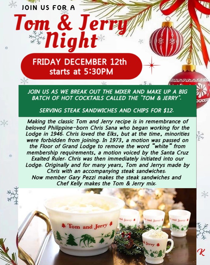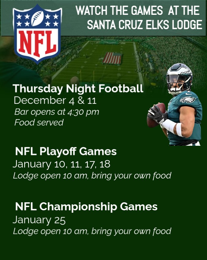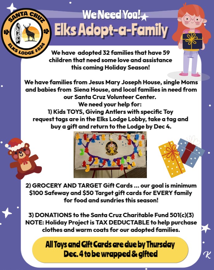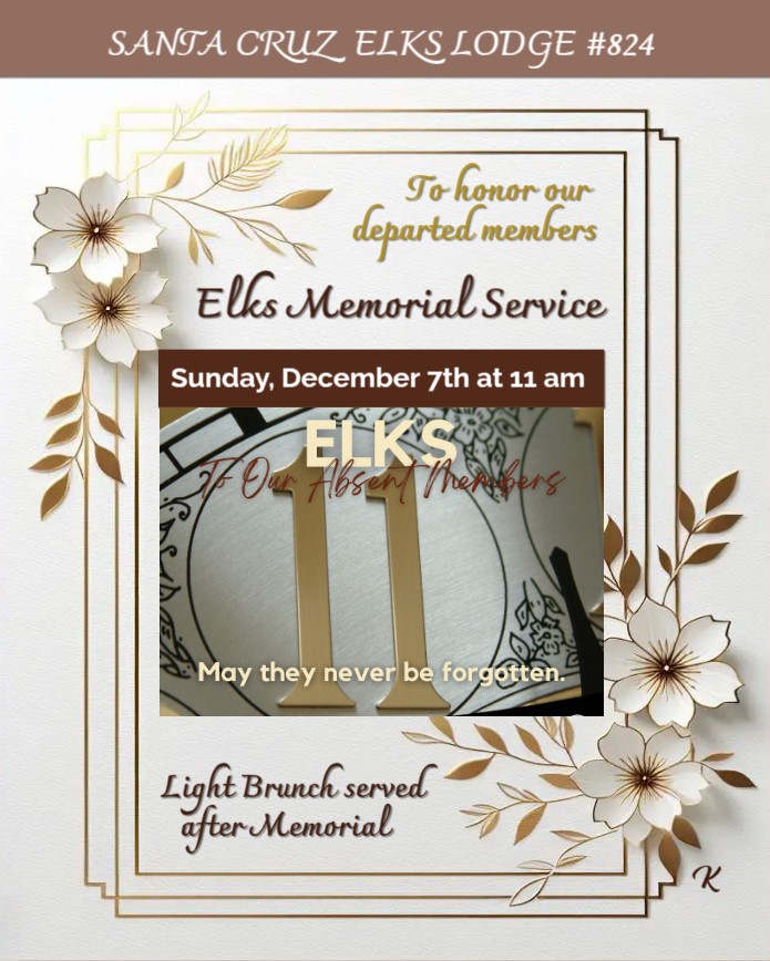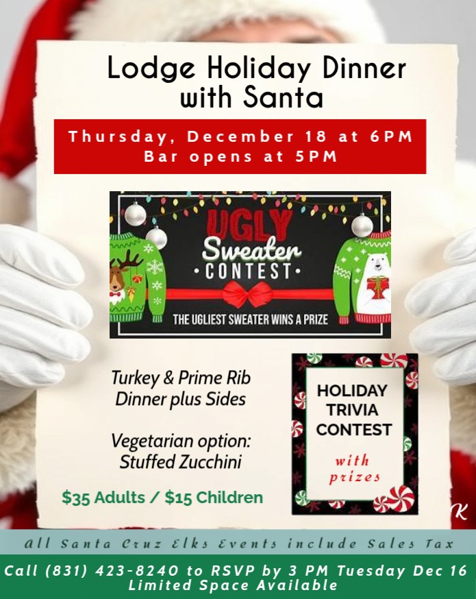 ![]() Welcome to the Santa Cruz Elks Lodge! We were established in 1903 and are located in sunny Santa Cruz. Upcoming EventsDecember 5 – 5 to 9 pm – Adopt-a-Family Gift WrappingDecember 7 – 11 am – Elks Memorial Service December 12 – 5:30 pm – Tom & Jerry Evening December 18 – 6 pm – Lodge Holiday Dinner with Santa Claus December 20 – January 4 – Lodge CLOSED for Holidays Tuesday Nights – 6 pm – Bingo Night Every Third Wednesday – 6 pm – Ladies Clothing Swap NFL Football – December/January Schedule Friday Nights – 5 pm – Poker Night Every Third Friday – 6:30 pm – Trivia Night How to JoinTo join, download the application here: Application. Once completed, return to the Lodge office with a $100 processing fee. If you are already a member of another Lodge and wish to join a different one, you need to fill out this form: Request for Release and return it to the Lodge with a $25 processing fee.The process: Our Lodge meets on the 2nd and 4th Thursdays of each month, and everything is predicated upon these two days. If you application is received before noon on the 4th Thursday, you will be initiated the following month. Once your application and fee are submitted, you will be required to attend an Investigation on the Wednesday prior to the 2nd Thursday. This meeting lasts about an hour. After that there is an Orientation at 7:00p on the Wednesday prior to the 4th Thursday, again this lasts about an hour and your sponsor and partner if any are encouraged to attend. Finally, Initiation is at 7:00p on the 4th Thursday. You and your sponsor are invited to a free steak dinner at 6:00p this night. The meeting lasts 1:30 – 2 hours. Bar Open Every Friday EveningWe are serving up fun for all every Friday evening at the Lodge year-round! The bar is open every Friday from 4:00pm-8pm for members and their guests. Join in the Lodge activities and bring friends!Small gatherings for members and their guests may also be scheduled for Friday evenings by contacting the Lodge office at 423-8240 during weekday business hours to verify space availability or emailing requests to sec824@santacruzelks.org | Office HoursMonday – Friday: 9am – 3pm Bar & Restaurant HoursMonday: 4:30p – 8:00p Thursday: 4:30p-9:00pFriday: 4:00p – 8:00p |